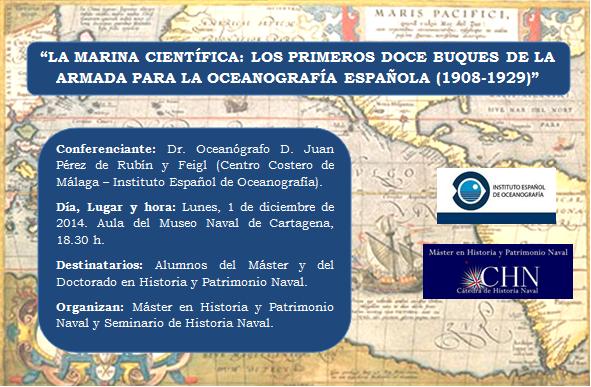 La Cátedra de Historia y Patrimonio Naval, a través del Máster en Historia y Patrimonio Naval, ha organizado la conferencia “La Marina Pacífica: los primeros doce buques de la Armada para la Oceanografía Española (1908-1929)”. Fue impartida por el Dr. Oceanógrafo D. Juan Pérez de Rubín Feigl (Centro Costero de Málaga – Instituto Español de Oceanografía).