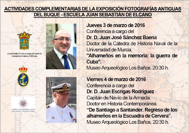 La Cátedra ha organizado, junto con el Ayto. de Alhama (Murcia), la exposición de fotografías y el ciclo de conferencias El buque-escuela Juan Sebastián Elcano. Celebrados del 26 de febrero al 4 de marzo de 2016 en el Museo Arqueológico Los Baños.