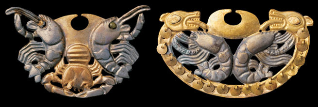 Narigueras de la dama de Cao con representación de crustáceos. Procede de excavaciones en Loma Negra, valle de Piura. Cultura Moche (200 a.C- 700 d.C). Fuente: Gabriel Bernat.