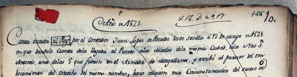 Carta escrita al rey por el contador Juan López de Recalde desde Sevilla a 12 de mayo de 1521 en que, dándole cuenta de la llegada al puerto de las Muelas dela misma ciudad de la nao San Antonio, una de las que fueron en la armada de Magallanes, y arribó al parecer del embocamiento del estrecho del mismo nombre, hace relación muy circunstanciada del suceso de la dicha armada, desde su salida de Barra de Sanlúcar hasta 20 de octubre de 1520, después que por mandado del mismo Magallanes fue juntamente con la nao Concepción al descubrimiento de una bahía que hallaron a la altura de 54º y medio después que salieron del puerto de San Julián, donde estuvieron invernando cinco meses (1794. Copia del original del Archivo General de Indias).