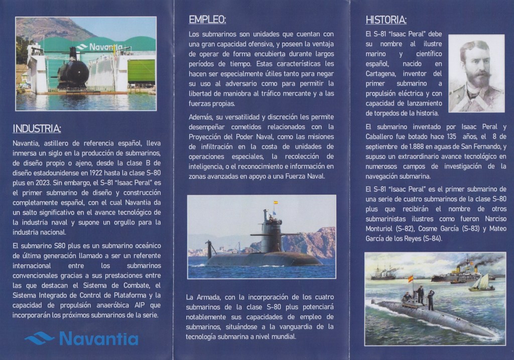 El pasado 30 de noviembre de 2023 en el Arsenal de Cartagena, se hizo entrega a la Armada del submarino S-81 «Isaac Peral». Es el primero de fabricación totalmente española y ha sido construido por la empresa Navantia. Sus características técnicas se pueden leer en el folleto adjunto, y de ellas destacamos una eslora de 81 metros y manga de más de 11 m. Puede albergar una dotación de 40 personas.