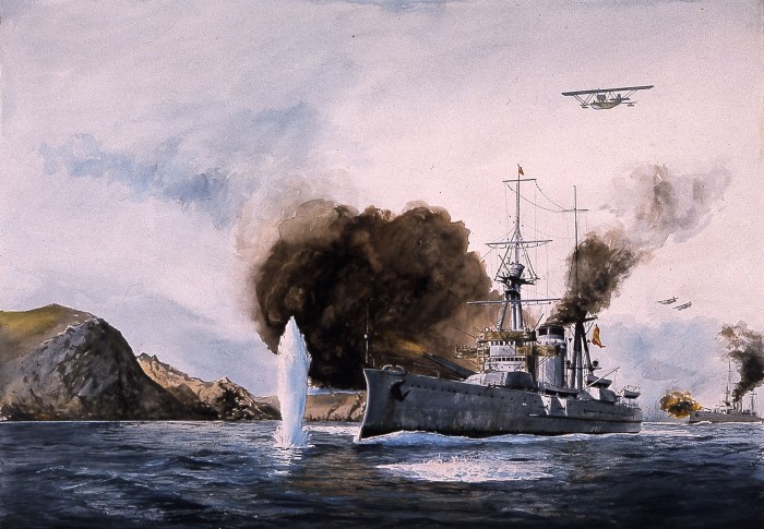 Documento del mes de abril de 2025 Cátedra de Historia y Patrimonio Naval / 1 abril, 2025 El acorazado Jaime I y el crucero Reina Victoria Eugenia bombardeando las posiciones rifeñas durante el desembarco de Alhucemas (1925) Accede al documento del mes. Accede a la imagen del documento. Compártelo: Haz clic para compartir en X (Se abre en una ventana nueva) X Haz clic para compartir en Facebook (Se abre en una ventana nueva) Facebook Me gusta Cargando...