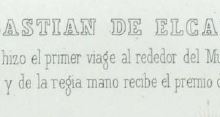 Sebastián de Elcano, el gran navegante español, el que hizo el primer viage alrededor del mundo, se presenta con sus compañeros al emperador Carlos V, y de la regia mano recibe el premio de aquella singular hazaña (litografía de 1854)